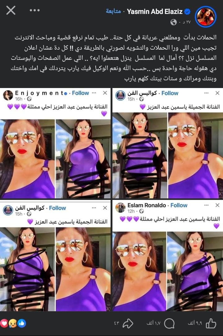 صدمت النجمة ياسمين عبد العزيز جمهورها ومتابعيها بمنشور ناري عبر حساباتها الرسمية، كشفت فيه عن تعرضها لحملة إلكترونية مشبوهة تستهدف النيل من سمعتها وتشويه صورتها أمام الرأي العام من خلال تداول صور “مفبركة” أو معدلة تظهرها بشكل غير لائق.
