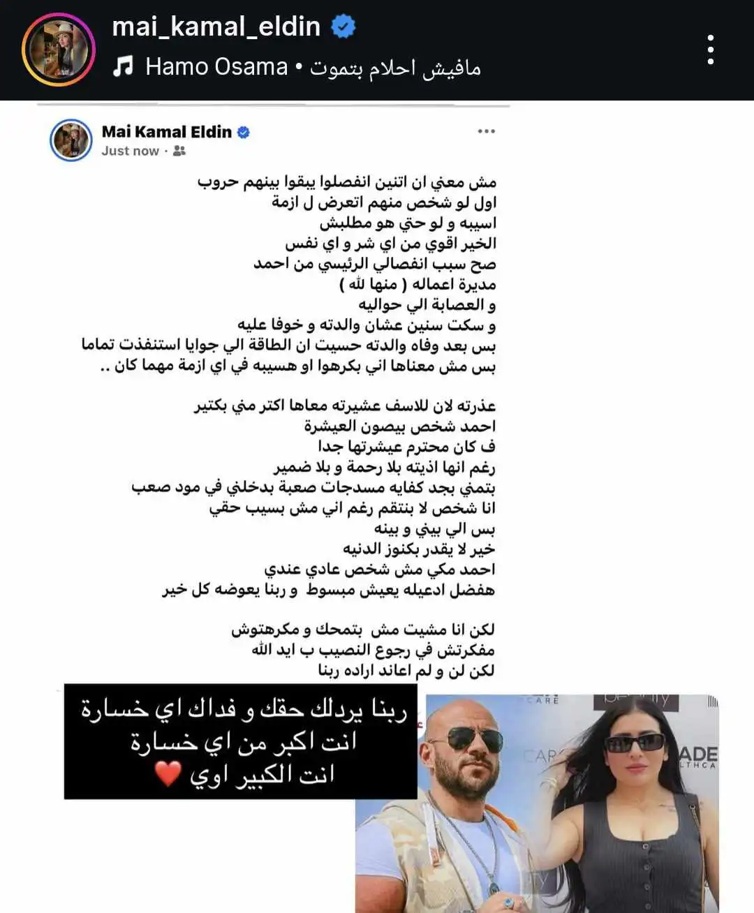 رغم قرار البعاد، شددت مي كمال على أن علاقتها بمكي لا تزال تحكمها القيم الإنسانية والود، مؤكدة أنها لا تحمل له أي ضغينة. ووصفت مكي بأنه شخص يقدر “العشرة” ويتمتع بالوفاء، لافتة إلى أن احترامها له يمنعها من معاداته، وأن الرابط الذي يجمعهما يتجاوز مسميات الزواج والطلاق.