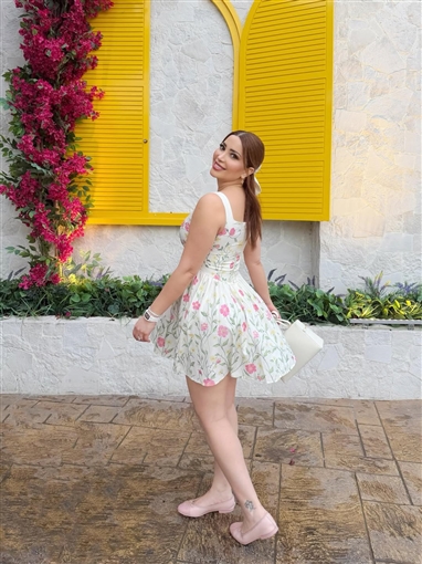 ظهرت نسرين طافش خلال جلسة التصوير بفستان أبيض قصير مزين برسومات نباتات وأزهار، أبرز رشاقتها وأناقتها.
