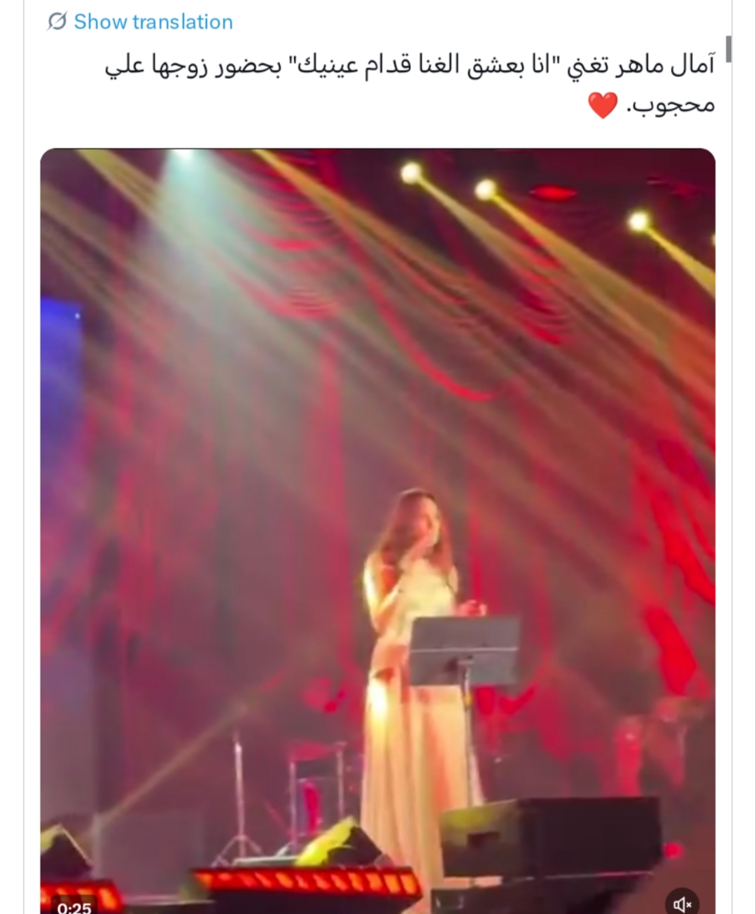 ظهرت آمال ماهر في الفيديو وهي تؤدي أغنيتها الشهيرة «بعشق الغنا قدام عينيك» بإحساس عالٍ، بينما كانت توجه نظراتها وكلمات الأغنية مباشرة إلى زوجها الذي كان حاضراً في الصفوف الأولى. ولم يخلُ المشهد من العفوية، حيث بادلها زوجها الابتسامات، مما عكس حالة من السعادة والانسجام بين الثنائي