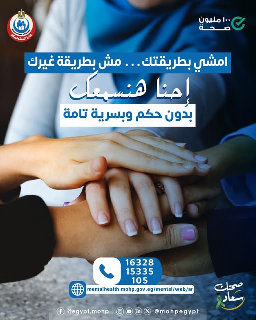 وتحت شعار «صحتك سعادة»، وجهت الوزارة رسالة توعوية تؤكد فيها: «امشِ بطريقتك… من غير ضغط ومن غير خوف»، موضحة أن كل فرد يمكنه طلب المساعدة والتحدث بحرية تامة دون أحكام، مع ضمان السرية الكاملة للخدمات المقدمة.