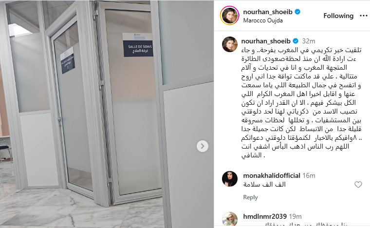 وأعربت الفنانة عن أسفها لعدم تمكنها من الاستمتاع بطبيعة المغرب التي كانت تتشوق لرؤيتها، مشيرة إلى أن القدر جعل نصيب الأسد من ذكرياتها في هذه الرحلة حتى الآن داخل المستشفيات، رغم وجود لحظات قصيرة “مسروقة” من السعادة. واختتمت حديثها بطلب الدعاء من جمهورها قائلة: “دعواتكم.. اللهم رب الناس اذهب البأس اشفِ أنت الشافي”.