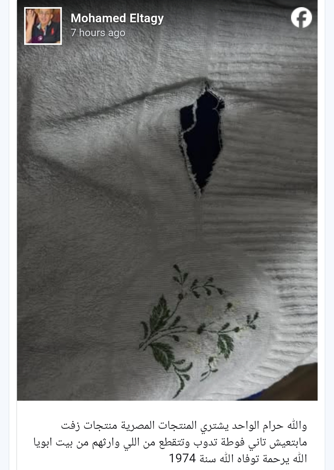 وقال التاجي، مازحًا، إن فوطة ورثها عن والدته منذ ما يقرب من 50 عامًا تمزقت مؤخرًا، في إشارة ساخرة إلى قوة المنتجات القديمة مقارنة بالحديثة، حيث كتب عبر حسابه على فيسبوك: