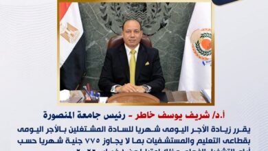 رئيس جامعة المنصورة يقرر زيادة الأجر الشهري للعاملين بقطاعي التعليم والمستشفيات